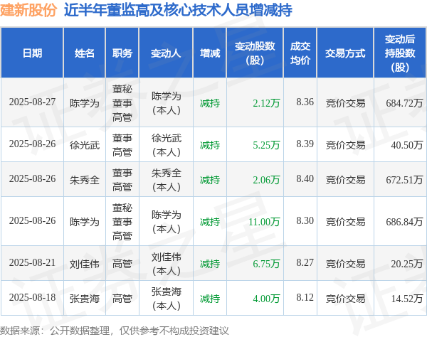 建新股份近半年内的董监高及核心技术人员增减持详情如下: